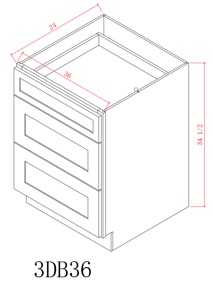 Base 36" - Slim Oak 36 Inches 3 Drawer Base Cabinet